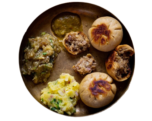 Litti Chokha, a famous dish originated from Bihar consisting four parts to it - making the litti, baingan bharta, aloo bharta, and tomato chutney.